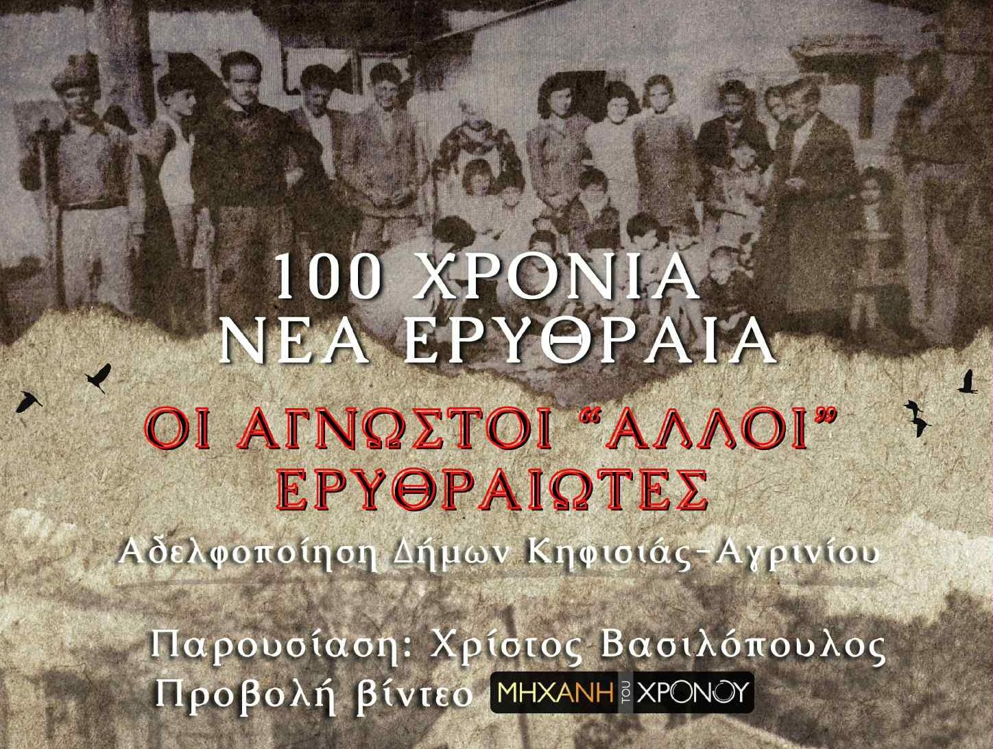 Επίσης, ο δημοσιογράφος και δημιουργός της εκπομπής «Μηχανή του Χρόνου» Χρίστος Βασιλόπουλος θα προβάλλει σπάνιο οπτικοακουστικό υλικό, παρουσιάζοντας μαρτυρίες και εικόνες από άλλες εστίες εγκατάστασης Ερυθραιωτών στην Αττική – όπως ο Βύρωνας, η Καισαριανή, η Νέα Φιλαδέλφεια και φυσικά από την Ν. Ερυθραία.