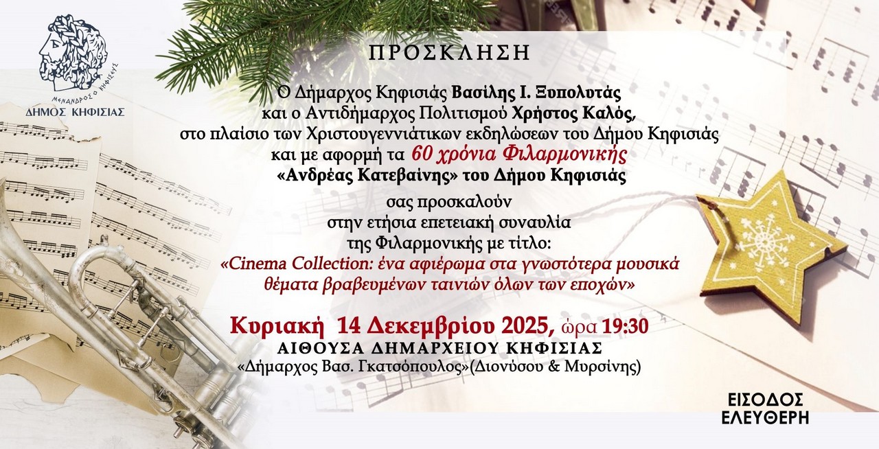 Ο Δήμαρχος Κηφισιάς Βασίλης Ι. Ξυπολυτάς και ο Αντιδήμαρχος Πολιτισμού Χρήστος Καλός, στο πλαίσιο των Χριστουγεννιάτικων εκδηλώσεων του Δήμου Κηφισιάς και με αφορμή τα 60 χρόνια Φιλαρμονικής «Ανδρέας Κατεβαίνης» του Δήμου Κηφισιάς σας προσκαλούν στην ετήσια επετειακή συναυλία της Φιλαρμονικής με τίτλο: «Cinema Collection: ένα αφιέρωμα στα γνωστότερα μουσικά θέματα βραβευμένων ταινιών όλων των εποχών», που θα πραγματοποιηθεί την Κυριακή 14 Δεκεμβρίου 2025, ώρα 19:30 στην Αίθουσα Δημαρχείου Κηφισιάς «Δήμαρχος Βασ. Γκατσόπουλος» (Διονύσου & Μυρσίνης 2).
