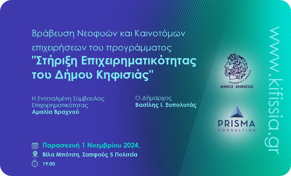 Σε μία λαμπερή εκδήλωση στη Βίλα Μπότση πραγματοποιήθηκε την Παρασκευή 1η Νοεμβρίου η βράβευση των Νεοφυών & Καινοτόμων Επιχειρήσεων του προγράμματος «Στήριξη Επιχειρηματικότητας του Δήμου Κηφισιάς».