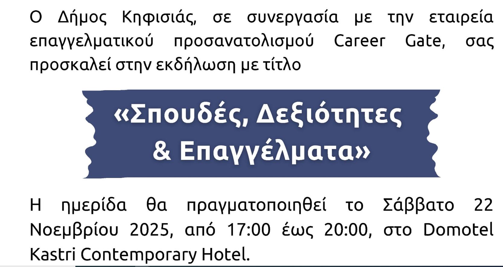 Ο Δήμος Κηφισιάς, σε συνεργασία με την εταιρεία επαγγελματικού προσανατολισμού Career Gate, σας προσκαλεί στην εκδήλωση, με τίτλο: «Σπουδές, Δεξιότητες και Επαγγέλματα», που θα πραγματοποιηθεί το Σάββατο, 22 Νοεμβρίου 2025, 5-8 μ.μ., στο Domotel Kastri Contemporary Hotel σε 4 θεματικά πάνελ ανά επιστημονικό πεδίο: (Τεχνολογικών και Θετικών Σπουδών & Σπουδών Οικονομίας και Πληροφορικής) (Ανθρωπιστικών, Νομικών και Κοινωνικών Σπουδών & Σπουδών Υγείας και Ζωής).