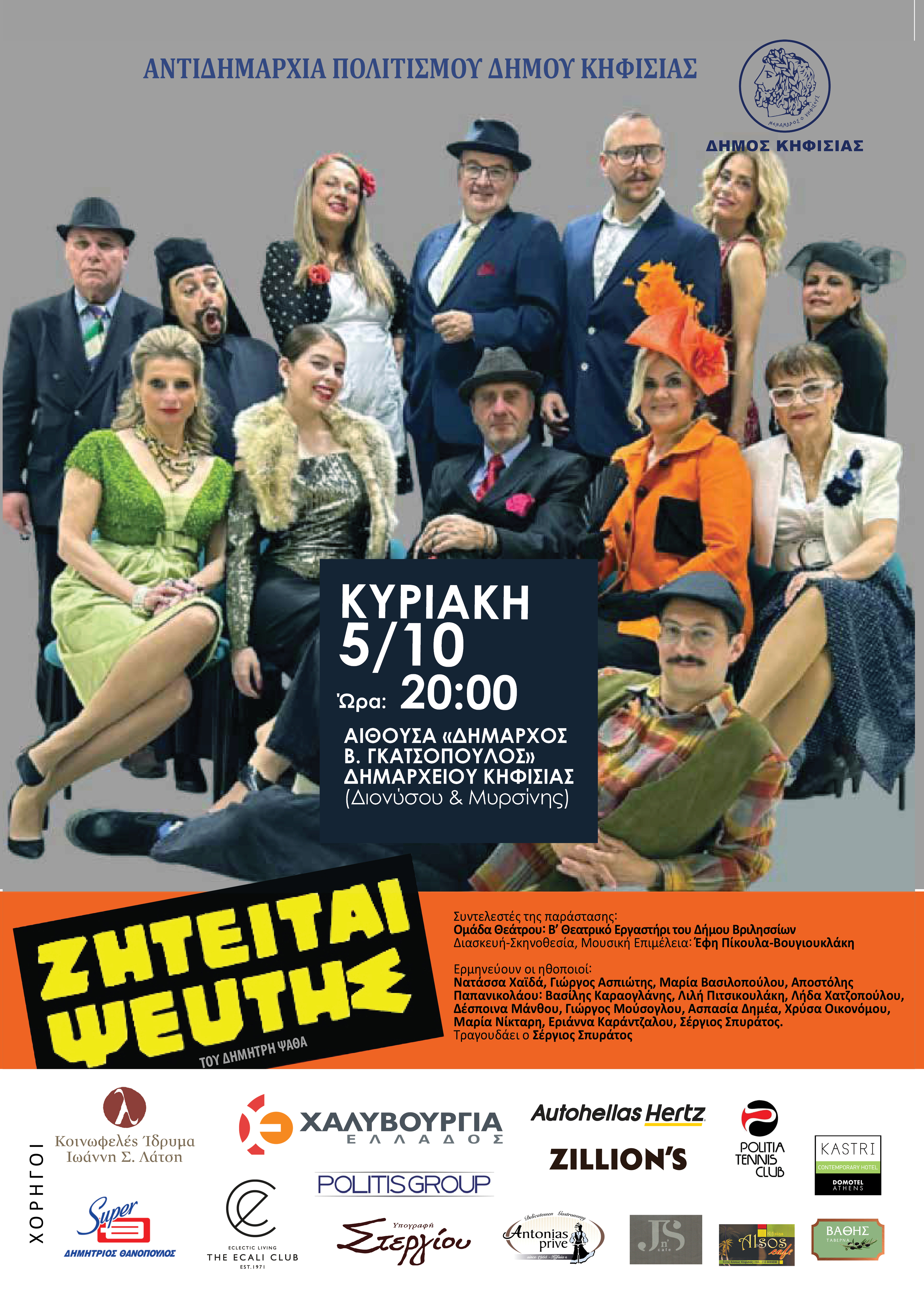 Σας ενημερώνουμε ότι η προγραμματισμένη εκδήλωση με τίτλο «ΖΗΤΕΙΤΑΙ ΨΕΥΤΗΣ», η οποία έχει προγραμματιστεί για την Κυριακή 05/10/25 & ώρα 20:00 στο Αίθριο Δημαρχείου Κηφισιάς, θα πραγματοποιηθεί λόγω καιρικών συνθηκών, εντός της αιθούσης του Πολιτιστικού «Δήμαρχος Β. Γκατσόπουλος».