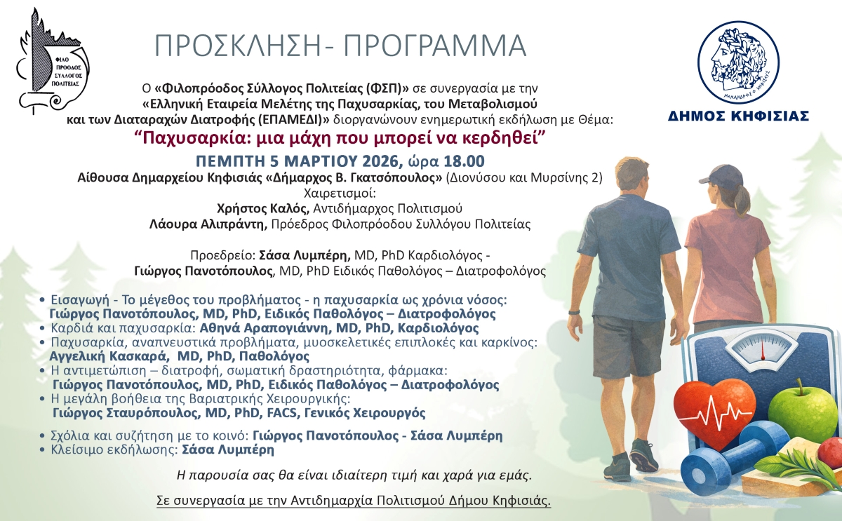 Ο «Φιλοπρόοδος Σύλλογος Πολιτείας (ΦΣΠ)» σε συνεργασία με την Αντιδημαρχία Πολιτισμού Δήμου Κηφισιάς & την «Ελληνική Εταιρεία Μελέτης της Παχυσαρκίας, του Μεταβολισμού και των Διαταραχών Διατροφής (ΕΠΑΜΕΔΙ)» διοργανώνουν ενημερωτική εκδήλωση με Θέμα: “Παχυσαρκία: μια μάχη που μπορεί να κερδηθεί” την Πέμπτη 5 Μαρτίου 2026, στις 18.00, στην Αίθουσα Δημαρχείου Κηφισιάς «Δήμαρχος Β. Γκατσόπουλος» (Διονύσου και Μυρσίνης 2).