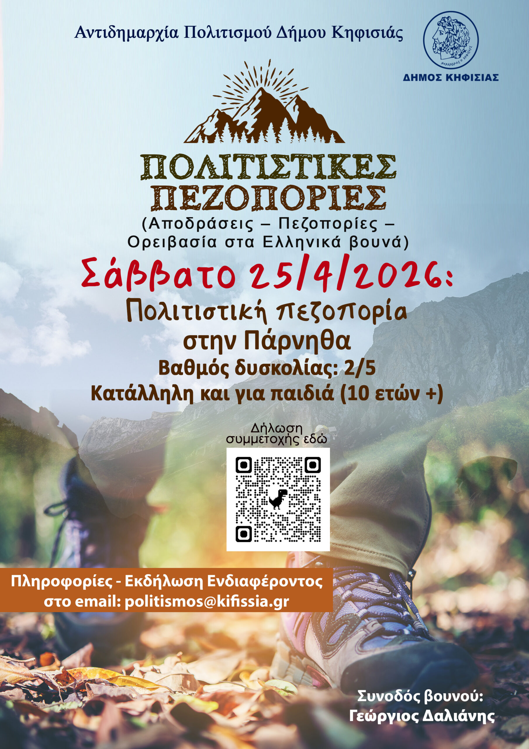 Πολιτιστική πεζοπορία στην Πάρνηθα | Σάββατο 25/04/2026 Μια διαφορετική διαδρομή, όχι τόσο συνηθισμένη. Με αφετηρία το Καταφύγιο Μπάφι, διανύουμε μια εύκολη και όμορφη πορεία μέσα στο ελατοδάσος της Πάρνηθας, μέχρι […]