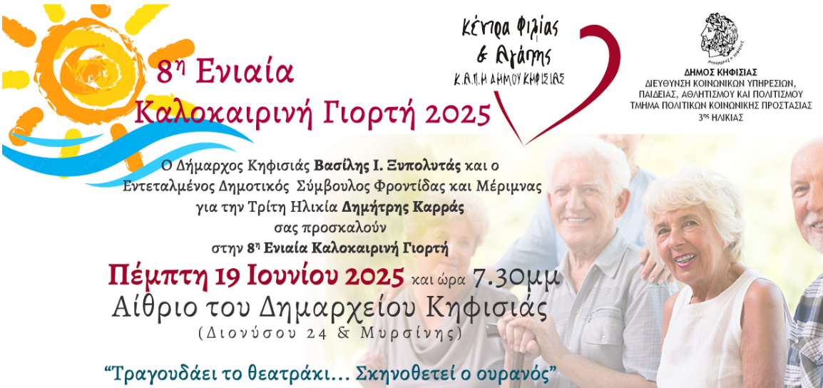 Ο Δήμαρχος Κηφισιάς Βασίλης Ι. Ξυπολυτάς και ο Εντεταλμένος Δημοτικός Σύμβουλος Φροντίδας και Μέριμνας για την Τρίτη Ηλικία Δημήτρης Καρράς σας προσκαλούν στην 8η Ενιαία Καλοκαιρινή Γιορτή ΚΑΠΗ, “Τραγουδάει το θεατράκι... Σκηνοθετεί ο ουρανός", που θα πραγματοποιηθεί την Πέμπτη 19 Ιουνίου 2025 και ώρα 7.30μμ στο Αίθριο του Δημαρχείου Κηφισιάς (Διονύσου 24 & Μυρσίνης).