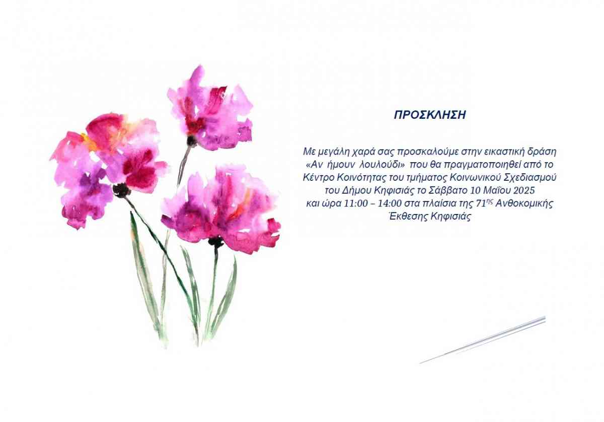 Στα πλαίσια της 71ης Ανθοκομικής Έκθεσης το Σάββατο 10 Μαΐου 2025 το Κέντρο Κοινότητας του τμήματος Κοινωνικού Σχεδιασμού του Δήμου Κηφισιάς πραγματοποίησε εικαστική δράση ανοικτή στο κοινό με τίτλο "Αν ήμουν λουλούδι". Οι επισκέπτες προσκαλέστηκαν να φιλοτεχνήσουν ζωγραφικά έργα με ακρυλικά χρώματα και πινέλα πάνω σε ατομικό καμβά μικρής διάστασης. Το δρώμενο είχε ως κύριο στόχο την ψυχική ενδυνάμωση μέσω της δημιουργικής έκφρασης και την ενίσχυση του ομαδικού πνεύματος μέσω της συνδιαλλαγής ιδεών στο αρμονικό περιβάλλον του Άλσους Κηφισιάς.
