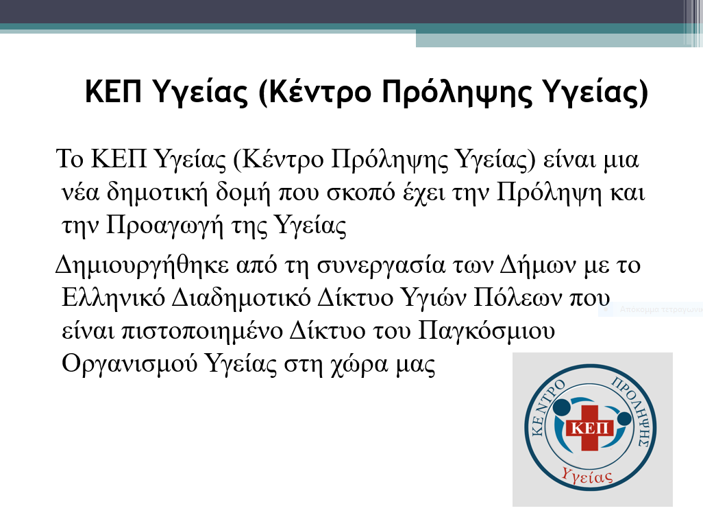 Πατήστε στην παρακάτω εικόνα για να δείτε ολόκληρη την παρουσιάση Powerpoint με τις δραστηριότητες του ΚΕΠ Υγείας: