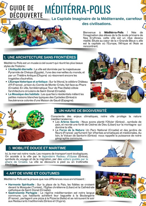 Συγκεκριμένα, όπως αναφέρεται σε σχετικό δελτίο τύπου του 2ου Δημοτικού Σχολείου Νέας Ερυθραίας, «ο φετινός διαγωνισμός της Γαλλοφωνίας 2026 (Concours national de la Francophonie 2026 – Grèce) ήταν αφιερωμένος στη Μεσόγειο. Με την καθοδήγηση της εκπαιδευτικού Γαλλικών Πελαγίας Σπακουρή και σε συνεργασία με την εκπαιδευτικό Πληροφορικής Γεωργία Λάσκαρη, οι μαθητές και μαθήτριες της ΣΤ’ τάξης επινόησαν μία φανταστική πόλη, η οποία κάλλιστα θα μπορούσε να είναι μία πρωτεύουσα της περιοχής της Μεσογείου. Οι μαθητές αρχικά έψαξαν και συνέλεξαν πληροφορίες για διάφορες χώρες της Μεσογείου, η οποία αποτελεί κοιτίδα πολιτισμών από την Αρχαιότητα. Έπειτα δημιούργησαν μία μακέτα αυτής της φανταστικής οικολογικής πρωτεύουσας, της έδωσαν ένα όνομα και περιέγραψαν στα γαλλικά, σε βίντεο, μέσα από τα μάτια του πολυμήχανου Οδυσσέα, τον τρόπο ζωής των κατοίκων, την αρχιτεκτονική, τα έθιμα, τα μέσα μεταφοράς και τη χλωρίδα της πόλης αυτής.