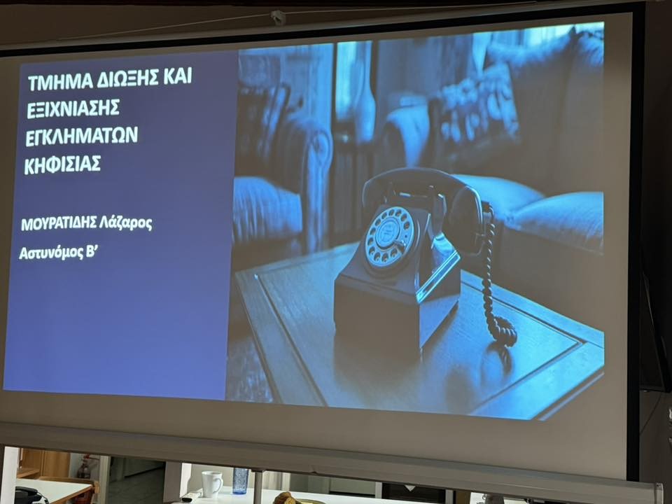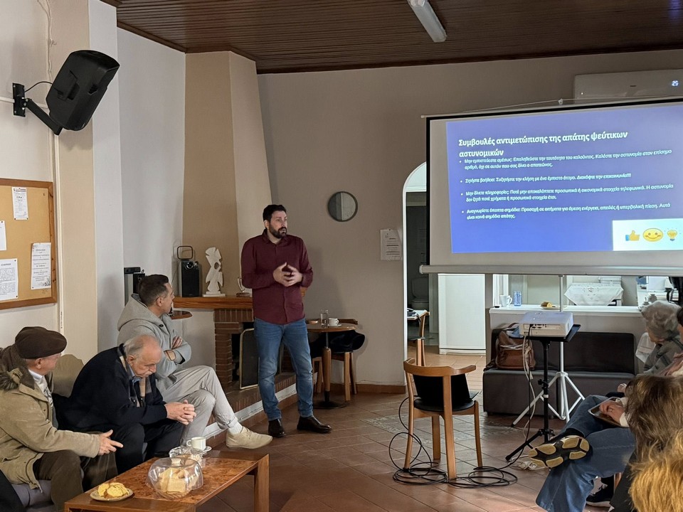 Ο Υποδιοικητής Τμήματος Ασφάλειας Κηφισιάς, Αστυνόμος Β’, Λάζαρος Μουρατίδης κατά την παρουσίασή του στα μέλη των Β’ & Γ’ ΚΑΠΗ Κηφισιάς, ανέλυσε τόσο προφορικά όσο και μέσα από σχετικές διαφάνειες τον τρόπο δράσης των απατεώνων μέσω τηλεφωνικών κλήσεων, διαδικτύου ή δια ζώσης επισκέψεων κατ’ οίκον, με σκοπό την απόσπαση χρηματικών ποσών ή τιμαλφών. Παράλληλα επέστησε την προσοχή των μελών σε αγνώστους που επικαλούνται διάφορες επαγγελματικές ειδικότητες (πχ υπάλληλοι-τεχνικοί ΔΕΔΗΕ, υπάλληλοι τραπεζών ή άλλων δημόσιων φορέων, λογιστές, δικηγόροι, ασφαλιστικοί σύμβουλοι κα), ενώ έγινε αναφορά σε και σε άλλες τεχνικές δραστών με πρόσχημα κάποιο «τροχαίο ατύχημα», μία υποτιθέμενη «νοσηλεία» ή «επιστροφές χρημάτων» από τράπεζες, κ.α.