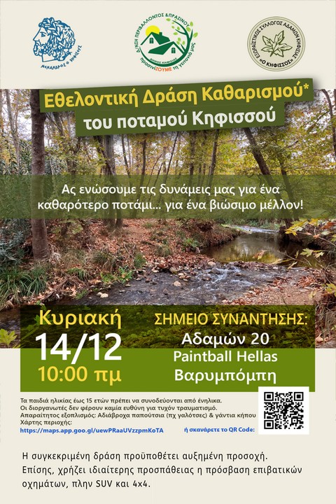Ο Δήμος Κηφισιάς ενημερώνει ότι την Κυριακή 14/12/2025 θα πραγματοποιηθεί ακόμη μία δράση εθελοντικού καθαρισμού του ποταμού Κηφισσού.