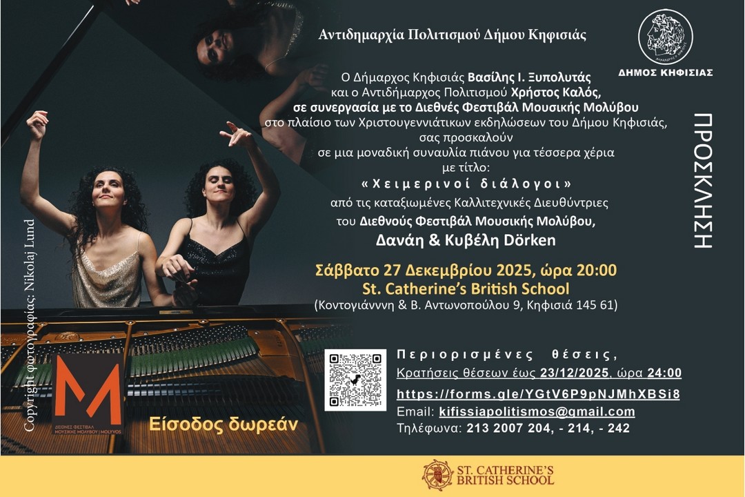 Ο Δήμαρχος Κηφισιάς Βασίλης Ι. Ξυπολυτάς και ο Αντιδήμαρχος Πολιτισμού Χρήστος Καλός, σε συνεργασία με το Διεθνές Φεστιβάλ Μουσικής Μολύβου στο πλαίσιο των Χριστουγεννιάτικων εκδηλώσεων του Δήμου Κηφισιάς, σας προσκαλούν σε μια μοναδική συναυλία πιάνου για τέσσερα χέρια με τίτλο: «Χειμερινοί διάλογοι» από τις καταξιωμένες Καλλιτεχνικές Διευθύντριες του Διεθνούς Φεστιβάλ Μουσικής Μολύβου, Δανάη & Κυβέλη Dörken.