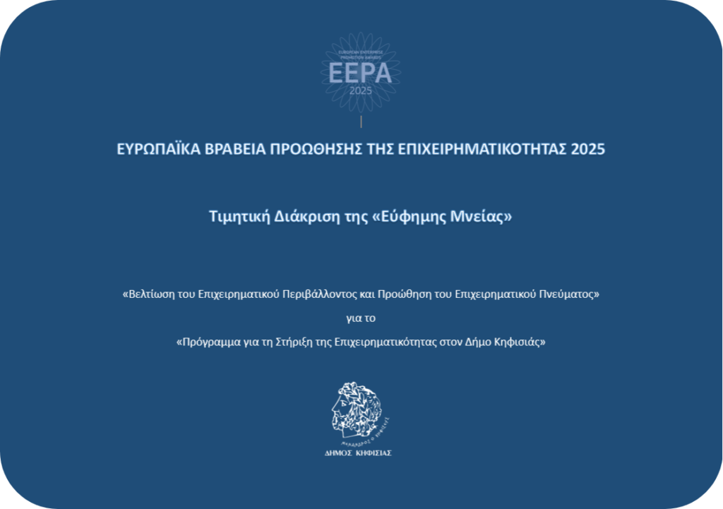 Πανελλήνια τιμητική διάκριση απέσπασε ο Δήμος Κηφισιάς στο πλαίσιο του διαγωνισμού για τα «Ευρωπαϊκά Βραβεία Προώθησης της Επιχειρηματικότητας 2025»