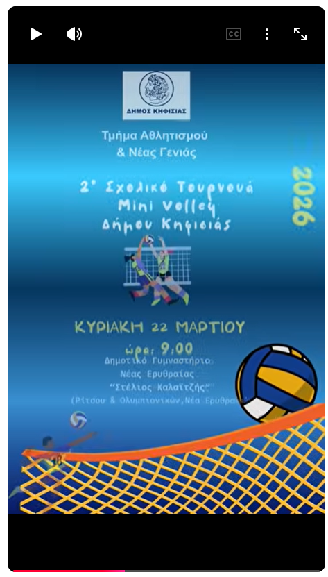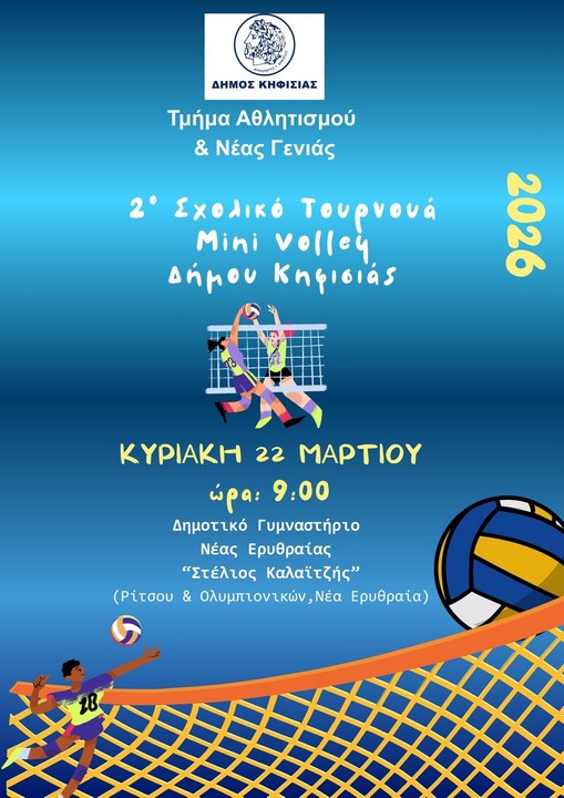 Το Τμήμα Αθλητισμού & Νέας Γενιάς του Δήμου Κηφισιάς διοργανώνει το 2ο Σχολικό Τουρνουά Mini Volley για μαθητές Ε’ & ΣΤ’ των Δημοτικών Σχολείων του Δήμου Κηφισιάς. Οι αγώνες θα διεξαχθούν στο Δημοτικό Γυμναστήριο Ν. Ερυθραίας “Στ. Καλαϊτζής” (Ρίτσου & Ολυμπιονικών, Ν. Ερυθραία) την Κυριακή 22 Μαρτίου στις 9:00 το πρωί.