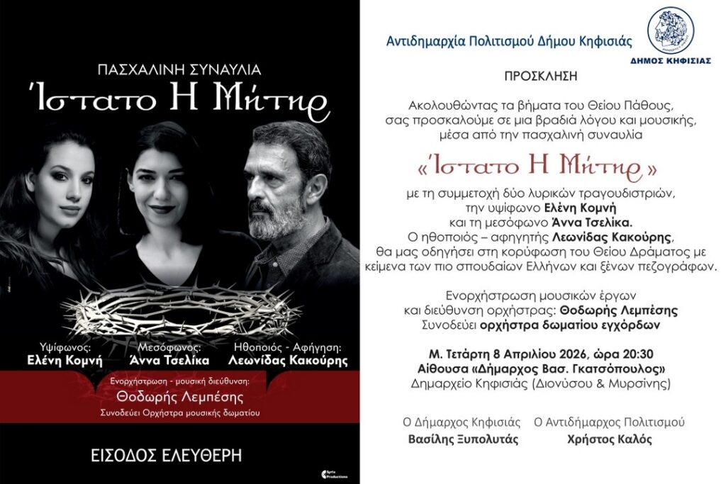 Ακολουθώντας τα βήματα του Θείου Πάθους, η Αντιδημαρχία Πολιτισμού του Δήμου Κηφισιάς σας προσκαλεί σε μια βραδιά λόγου και μουσικής, μέσα από την πασχαλινή συναυλία «Ίστατο Η Μήτηρ» που θα πραγματοποιηθεί την Τετάρτη 8 Απριλίου 2026, στις 20:30 στην Αίθουσα «Δήμαρχος Βασ. Γκατσόπουλος» του Δημαρχείου Κηφισιάς (Διονύσου & Μυρσίνης).