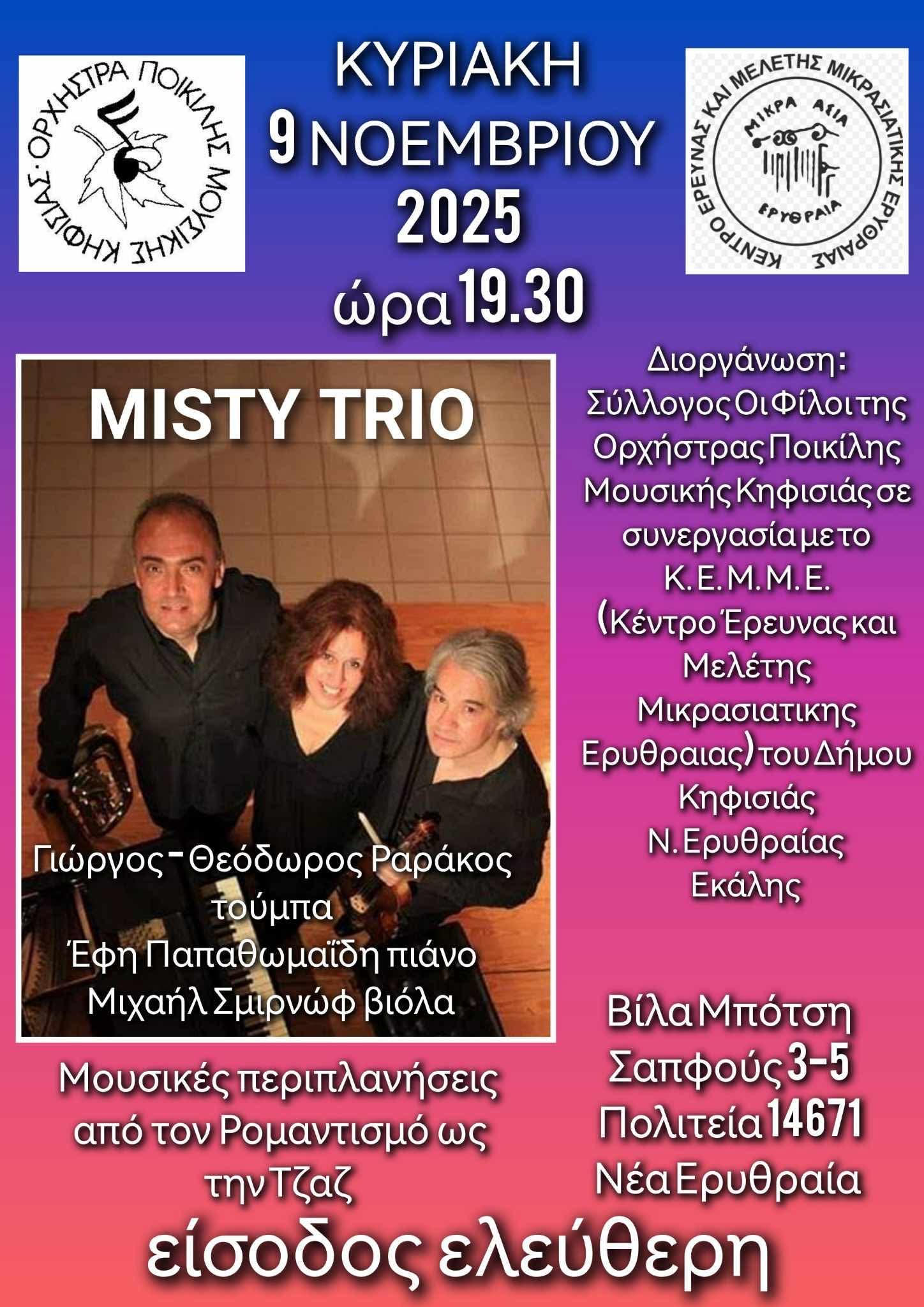 Ο Σύλλογος «Οι Φίλοι της Ορχήστρας Ποικίλης Μουσικής Κηφισιάς», σε συνεργασία με το Κέντρο Έρευνας και Μελέτης της Μικρασιατικής Ερυθραίας (Κ.Ε.Μ.Μ.Ε) του Δήμου Κηφισιάς, Νέας Ερυθραίας και Εκάλης σας προσκαλούν την Κυριακή 9 Νοεμβρίου, ώρα 7:30 μ.μ. στη Βίλα Μπότση (Σαπφούς 3-5, Πολιτεία-Νέα Ερυθραία) στη συναυλία Μουσικές περιπλανήσεις από τον Ρομαντισμό έως την Τζαζ με το MISTY TRIO: Έφη Παπαθωμαΐδη (πιάνο), Γιώργος Ραράκος (τούμπα) και Mikhail Smirnov (βιόλα).