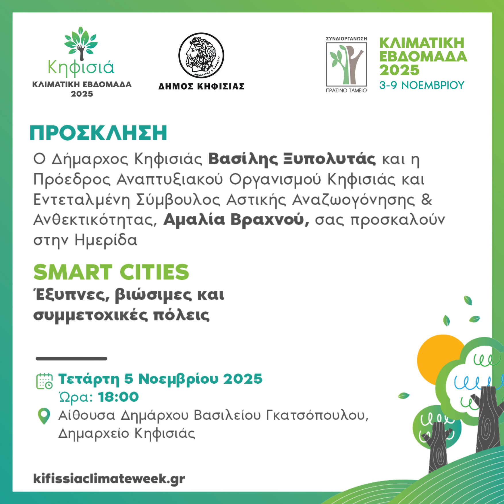 Με την ενδιαφέρουσα Ημερίδα: «Smart Cities. Έξυπνες και Συμμετοχικές Πόλεις» συνεχίζονται την Τετάρτη 5 Νοεμβρίου, στις 18.00, στην Αίθουσα «Β. Γκατσόπουλου» του Δημαρχείου Κηφισιάς, οι δράσεις στο πλαίσιο της 2ης Κλιματικής Εβδομάδας Κηφισιάς, που διοργανώνει ο Δήμος Κηφισιάς-Νέας Ερυθραίας-Εκάλης με συν διοργανωτή το Πράσινο Ταμείο.