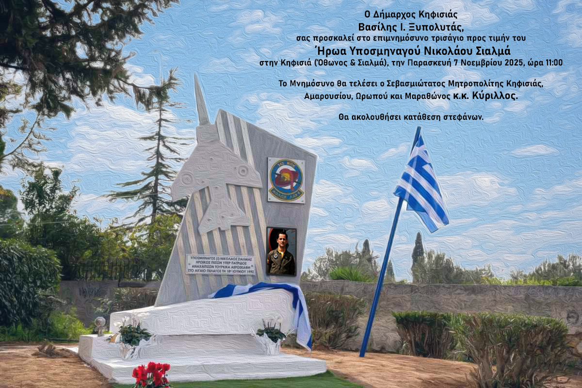 O Δήμαρχος Κηφισιάς κ. Βασίλης I. Ξυπολυτάς, σας προσκαλεί να τιμήσετε με την παρουσία σας το επιμνημόσυνο τρισάγιο του Ήρωα Υποσμηναγού Νικολάου Σιαλμά.