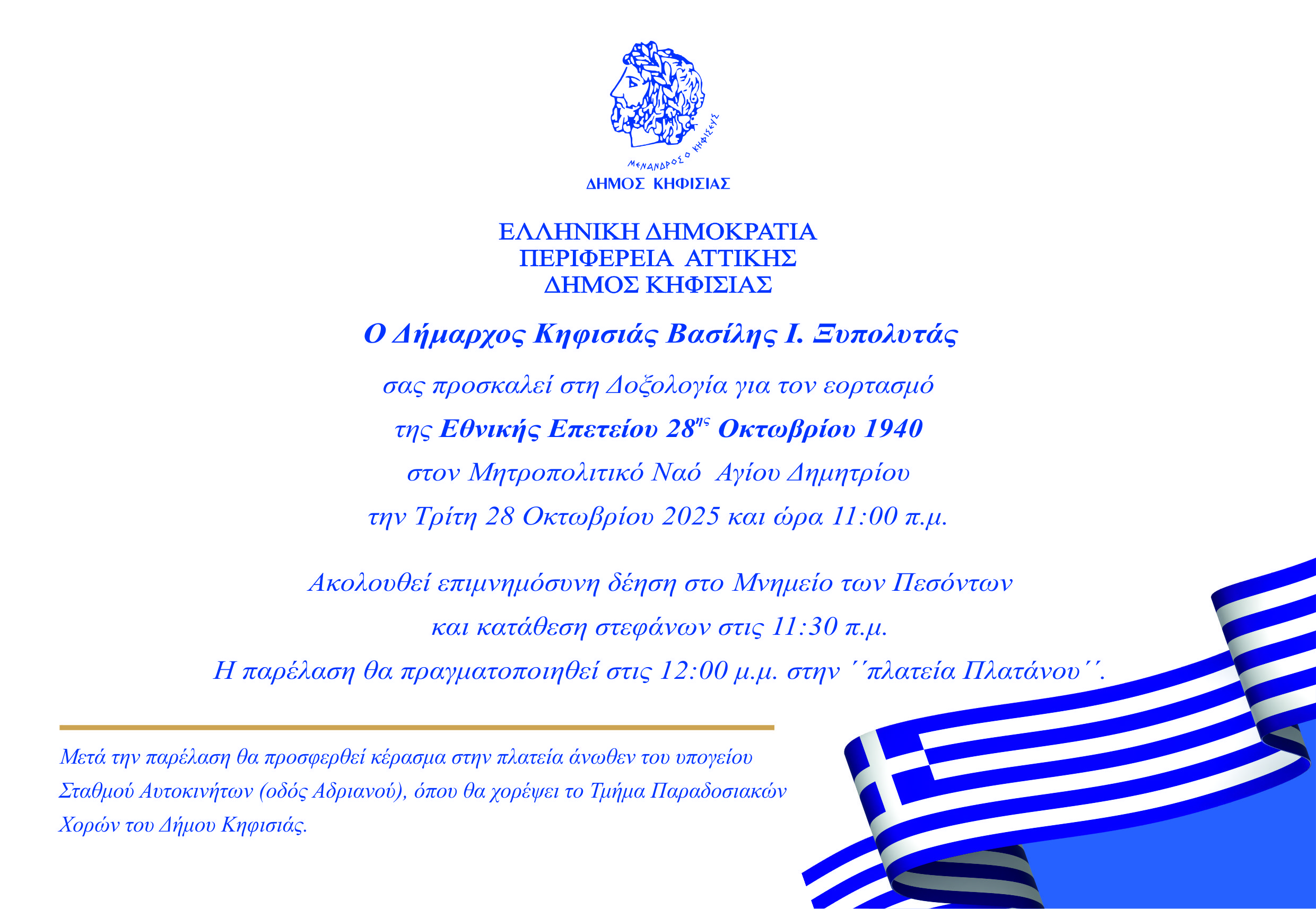 Με κάθε επισημότητα και λαμπρότητα ο Δήμος Κηφισιάς τιμά και φέτος με μια σειρά εορταστικών εκδηλώσεων, την εθνική επέτειο της 28ης Οκτωβρίου 1940 και τον εορτασμό του Πολιούχου του Δήμου, Αγίου Δημητρίου του Μυροβλήτου.